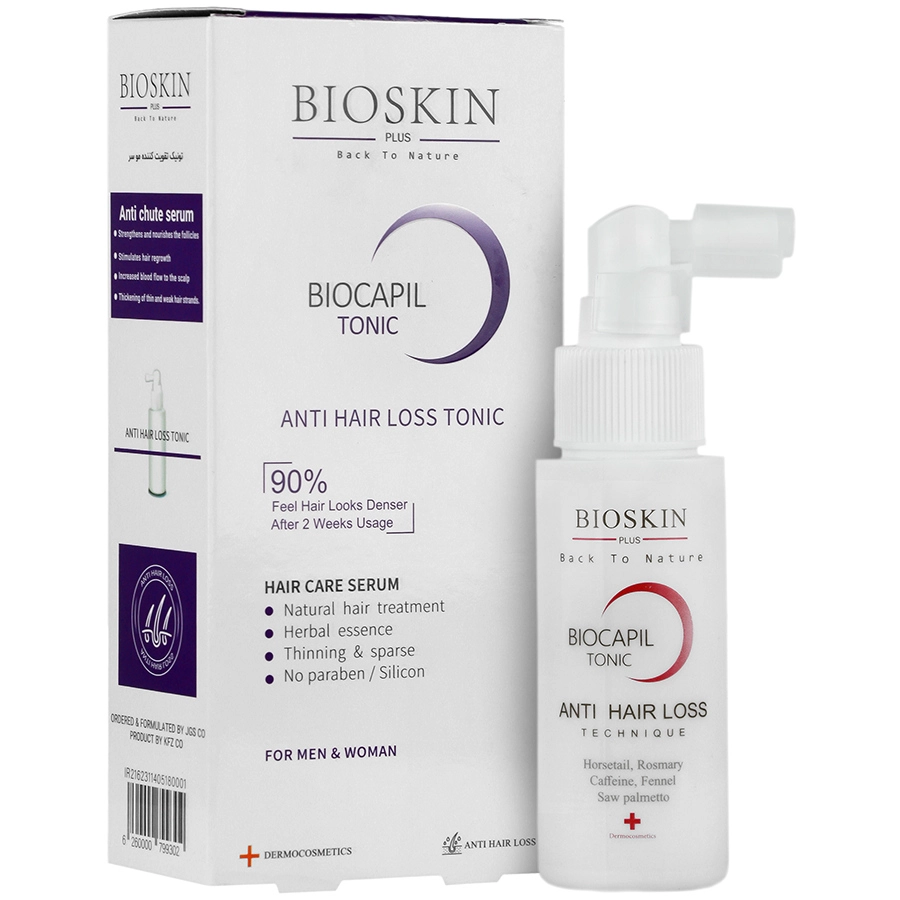 تونیک ضد ریزش مو بایوکاپیل بایو اسکین پلاس به تقویت فولیکول‌های مو، جلوگیری از ریزش مو، ضخامت تارهای مو و رشد سریع مو کمک می‌کند و قابل استفاده برای آقایان و خانم‌های بالای 14 سال است.
